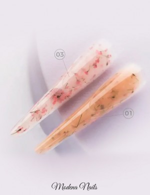 Gel constructor de densidad media con flores secas naturales incorporadas, que aporta durabilidad profesional y un toque artístico y elegante. Ideal para reforzar, extender y decorar uñas con estilo romántico y fresco.